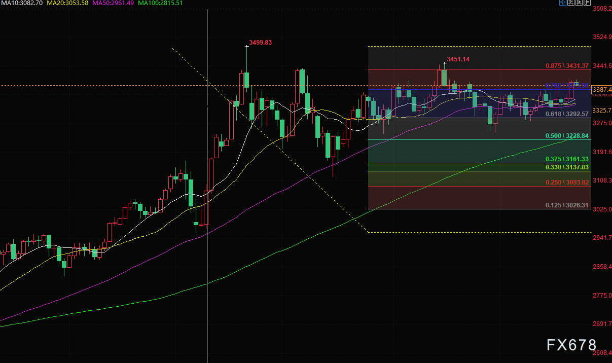 周二(7月22日)亚洲早盘黄金价格触及一个多月高点3403美元后出现回落,目前交投于3386.33美元/盎司附近。买家暂时休整,等待8月1日截止日前美国潜在贸易协议的明确消息。美元在关税不确定性和对美联储的担忧中巩固了下行态势。黄金价格周一收于关键斐波那契阻力位上方,任何下行空间似乎都有限。