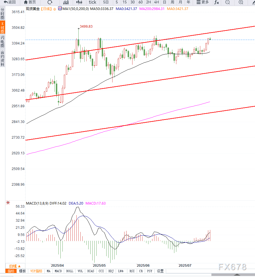 3,400美元为首个技术支撑,其次为3,370前阻力转为支撑区间;3430美元为短期高点,若突破则将指向7月高位3450区间,甚至挑战4月历史高点3,500美元。