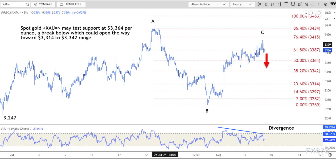 路透技术分析师指出,现货黄金可能测试每盎司 3364 美元的支撑位,跌破该水平可能打开通往 3314 美元至 3342 美元区间的道路。