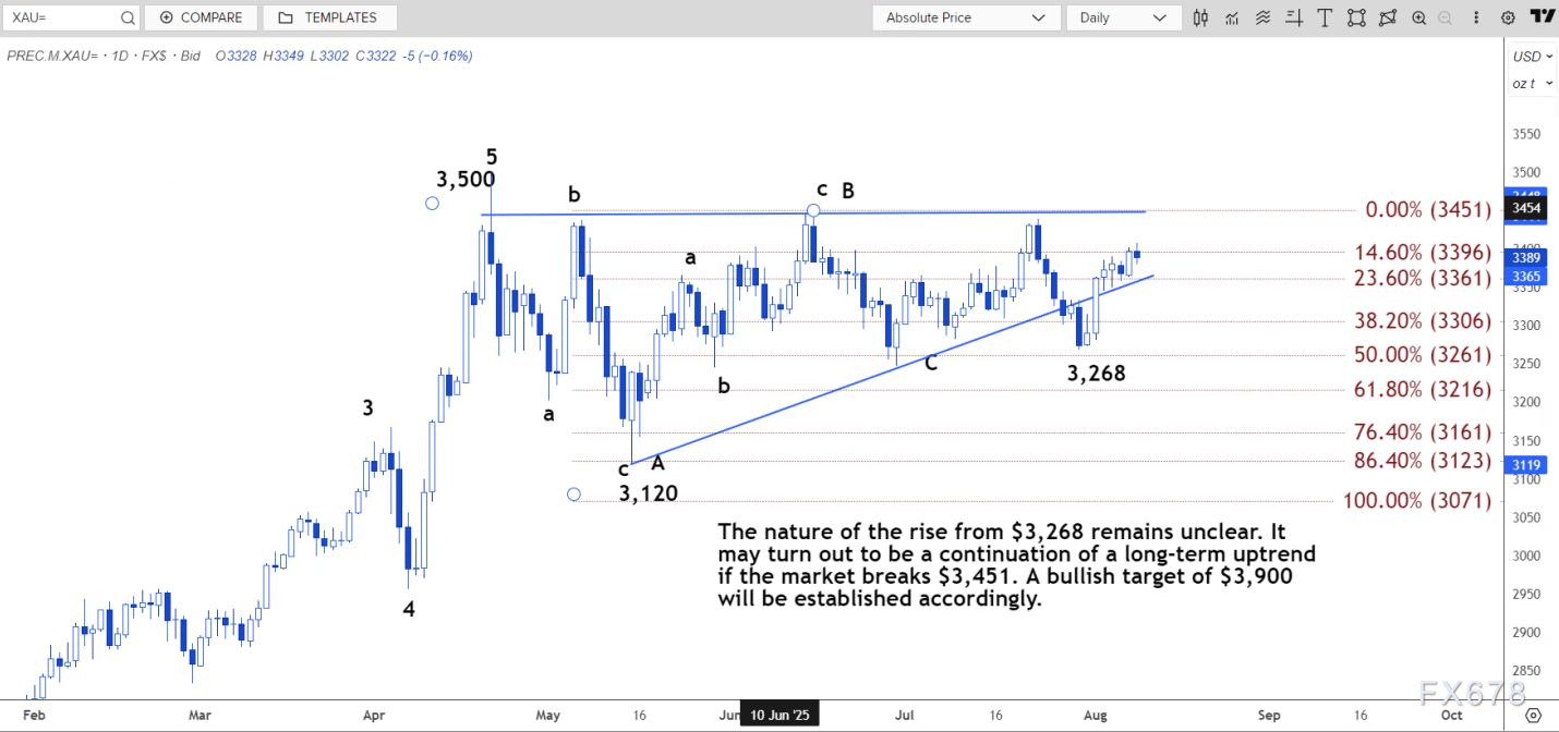 日线图显示,自3268美元以来的上涨趋势仍不明朗。如果市场突破3451美元,则可能延续长期上涨趋势。因此,看涨目标位将指向3900美元。