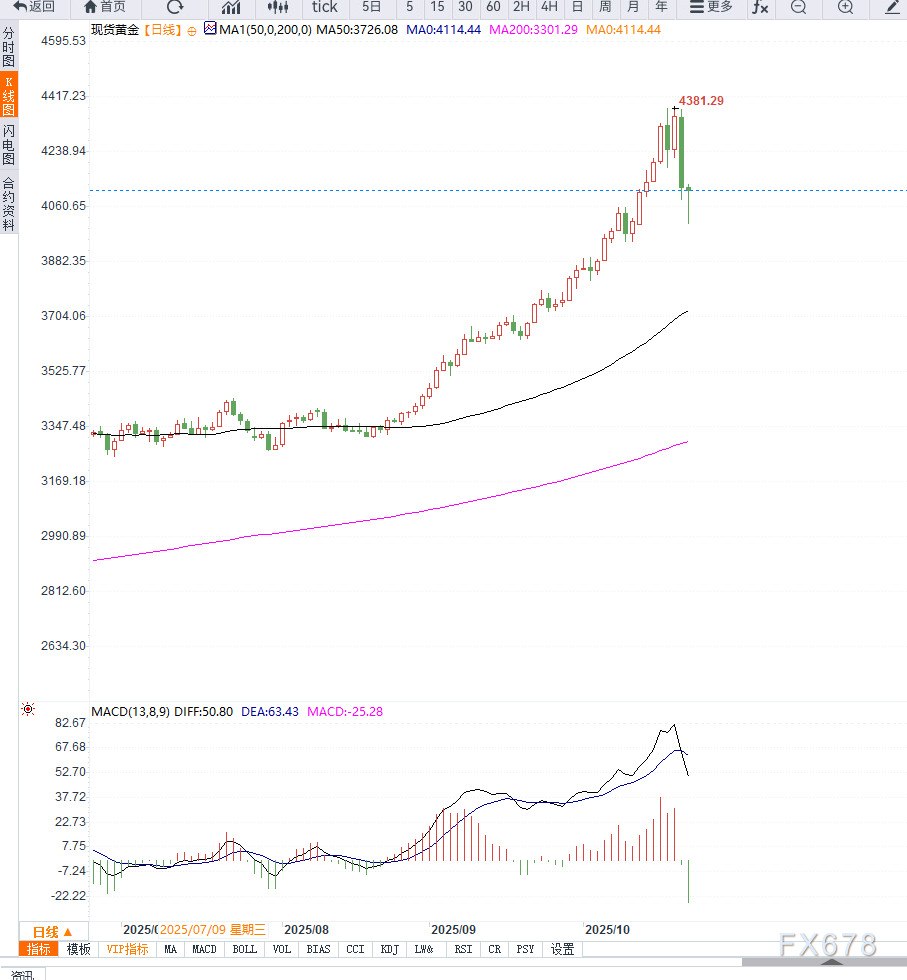 黄金周三亚洲时段延续跌势,盘中最低触及约4,000美元/盎司,此前在周二出现超过6%的单日大幅回落,为十余年来最大日内跌幅。