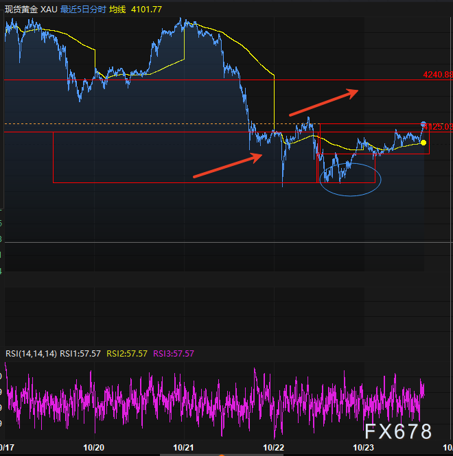 周四(10月23日)欧美时段,现货黄金宽幅震荡,守住周三反弹的主要阵地。