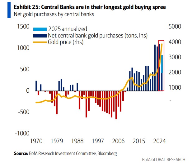 过去数年金价的持续攀升,主要得益于央行大规模购金——尤其在西方对俄制裁后,新兴市场国家为降低美元依赖而积极增持。美国总统特朗普今年年初上台后引发的地缘政治不确定性及美国债务忧虑,亦助推了金价上涨。