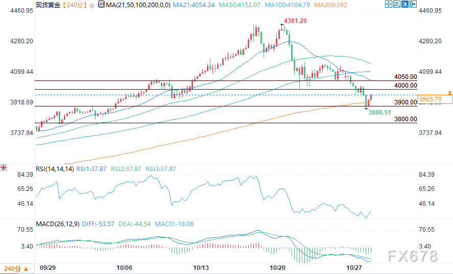 周二(10月28日),现货黄金在早盘遭受沉重抛售压力后企稳,因投资者在风险偏好情绪回升的情况下继续撤出避险资产。现货黄金盘中报3968.67美元左右,当日下跌0.31%,此前曾短暂跌破3900美元关口,创下三周来的最低水平。