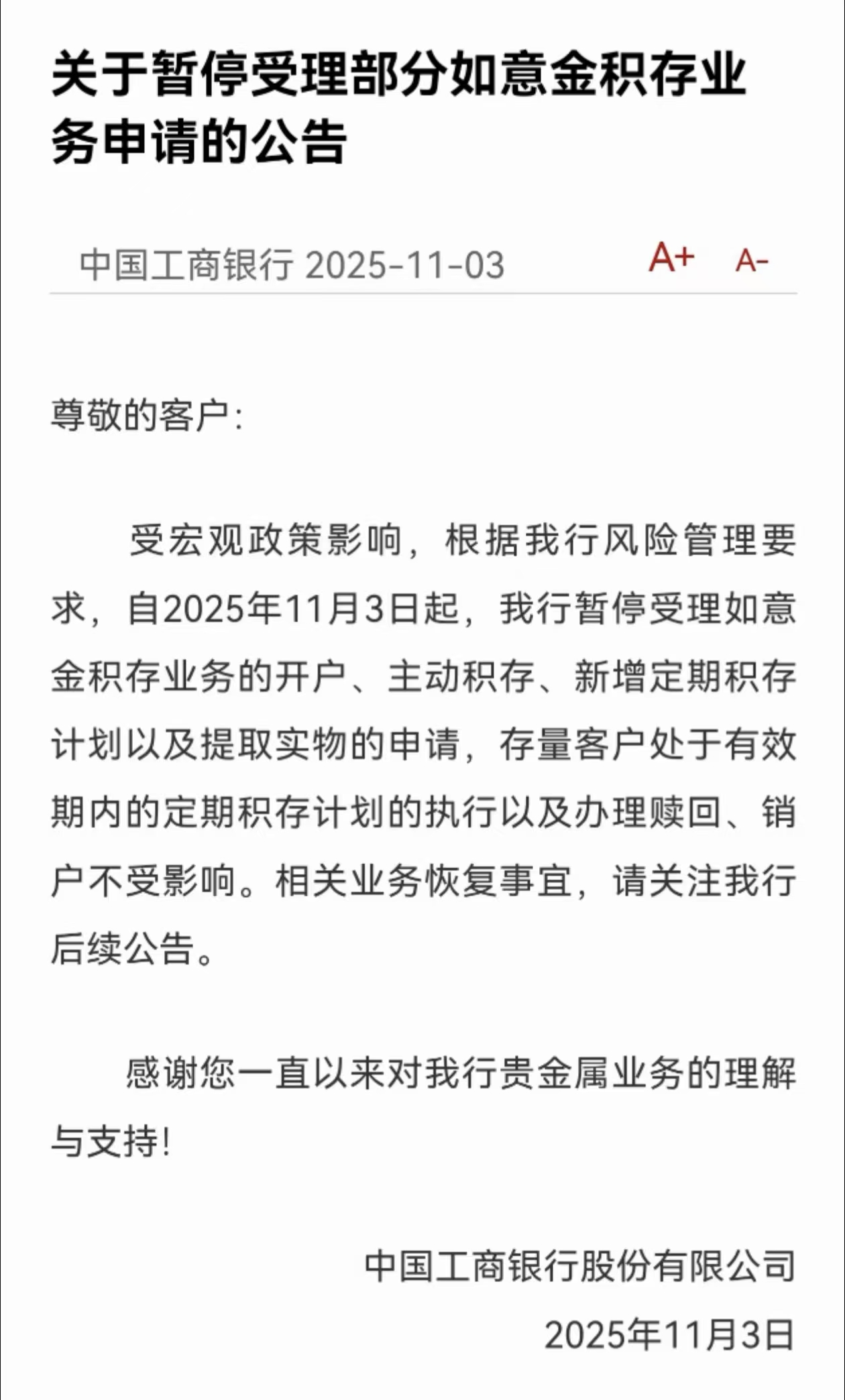 11月3日金融一线消息,工商银行今日发布公告称,受宏观政策影响,根据我行风险管理要求,自2025年11月3日起,我行暂停受理如意金积存业务的开户、主动积存、新增定期积存计划以及提取实物的申请,存量客户处于有效期内的定期积存计划的执行以及办理赎回、销户不受影响。相关业务恢复事宜,请关注我行后续公告。