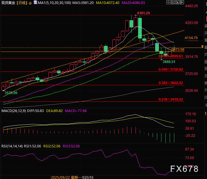 现货黄金回调至上涨斐波那契0.618分位后展开反弹,如果持续收在3973.58之上则有机会继续上行,压力在4100附近,如果守不住3973.58则金价大概率回踩3886.51低点,之后是斐波那契0.5分位的3750附近,同时也是金价头肩顶大形态的量度跌幅位置。