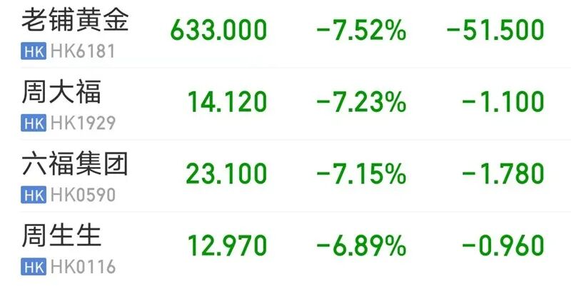 11月3日早盘,港股黄金零售品牌商集体下挫。截至发稿,老铺黄金、周大福、六福集团大跌超7%,周生生跌超6%。