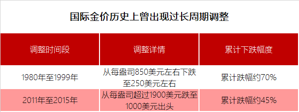 更早的一波金价长周期调整则是在1980年至1999年期间。数据显示,1980年国际金价从每盎司850美元左右高位滑落后,即进入漫长的调整期,直到1999年方才触底,最低下跌至250美元左右,这期间累计下跌幅度约70%,累计调整时间长达20年左右。