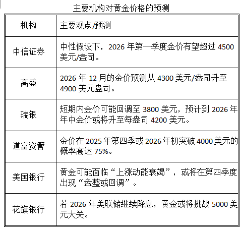 基于上述逻辑,机构纷纷上调金价预期,比如,高盛将2026年12月黄金价格预期上调至4900美元;花旗银行认为,若2026年美联储继续降息,黄金或将挑战5000美元大关。但随着黄金价格屡创新高,也有观点认为市场需防范短线调整风险,比如美国银行提示金价或在第四季度出现“盘整或回调”。但整体上,机构仍相对看好黄金价格的长期趋势。
