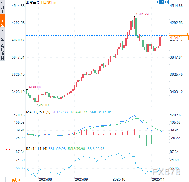 本周黄金市场重获动能,周二(11月11日)金价已连续第三个交易日上涨,涨幅约0.44%,交投于4133美元/盎司附近。尽管黄金已突破近期关键阻力位,但要收复上月触及的4381.29美元/盎司历史高点仍面临显著阻力。