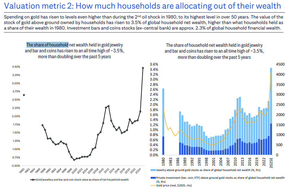 “我们估计……全球黄金支出占GDP的比重已超过0.55%……这是55年数据中迄今最高的运行率……由家庭持有的地上黄金存量价值已升至全球家庭净财富的3.5%,高于1980年家庭财富中的占比。”