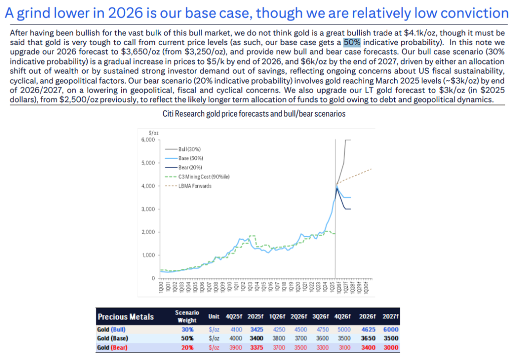 不过,花旗也为投资者描绘了另外两种截然不同的可能性。在30%概率的牛市情景中,持续的结构性问题,如美国财政可持续性危机或地缘政治紧张局势升级,将推动投资者持续涌入黄金,可能将金价在2026年底推高至5000美元,并在2027年底进一步升至6000美元。