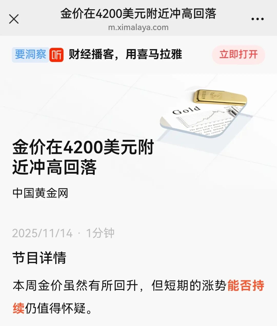 11月13日晚间,黄金思享家直播栏目第一时间邀请高级黄金投资分析师吕超分析美国政府开门对国际金价的影响,吕超在直播中提示谨防国际金价遭遇获利抛盘导致下挫的风险。