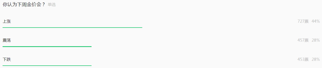 11月10日当周,伦敦金价格开盘4004.88美元/盎司,最高4245.33美元/盎司,最低4004.04美元/盎司,收盘4084.62美元/盎司。市场人士认为本周国际金价震荡可能性较大。投票显示,有44%的读者看涨本周金价、28%看震荡、28%看空。