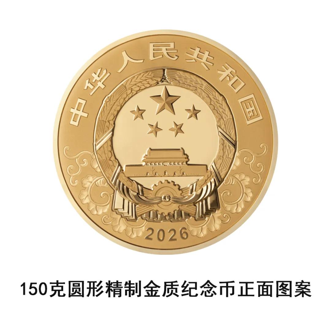150克圆形金质纪念币为精制币,含纯金150克,直径60毫米,面额2000元,成色99.9%,最大发行量1000枚。