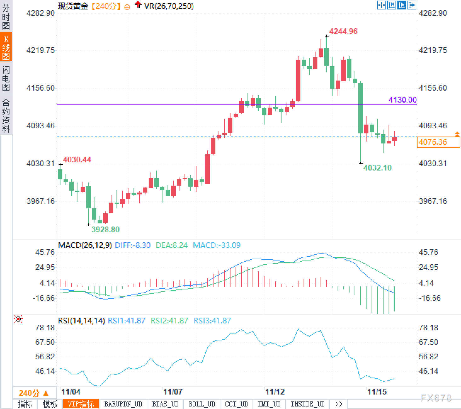 4小时K线图显示,金价自高点4244.96回撤后,呈现自上而下的台阶式回落结构。当前价格于4100下方运行,且明显受制于4130.00的阻力压制,这一价位兼具“前高回撤后的首次回测位”与“密集成交区上沿”的双重属性,短线被视作关键阻力。下方最近支撑关注4032.10,一旦跌破,前期低点3928.80将成为更中期的趋势分水岭。