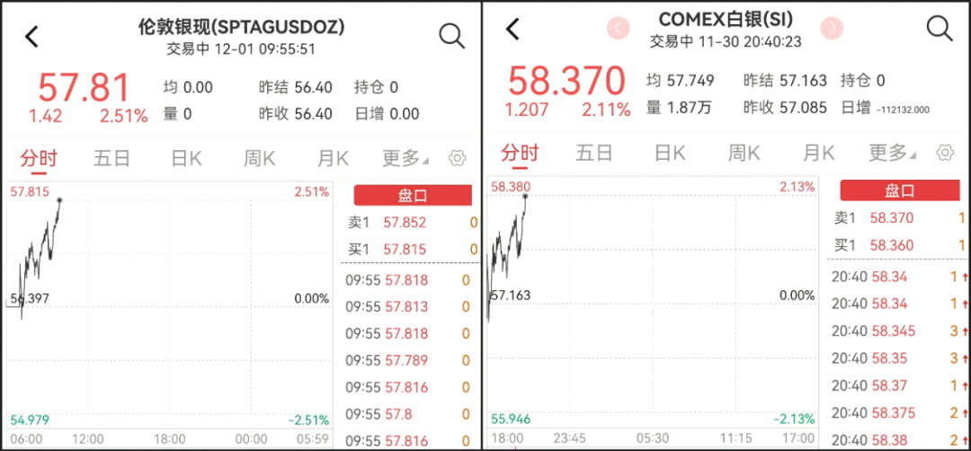 现货白银连续6个交易日走高,首次触及57美元/盎司,现报57.81美元/盎司,年内涨超100%,成为年内表现极为强势的品种之一;纽约期银跟涨,现报58.370美元/盎司,年内涨超99%。