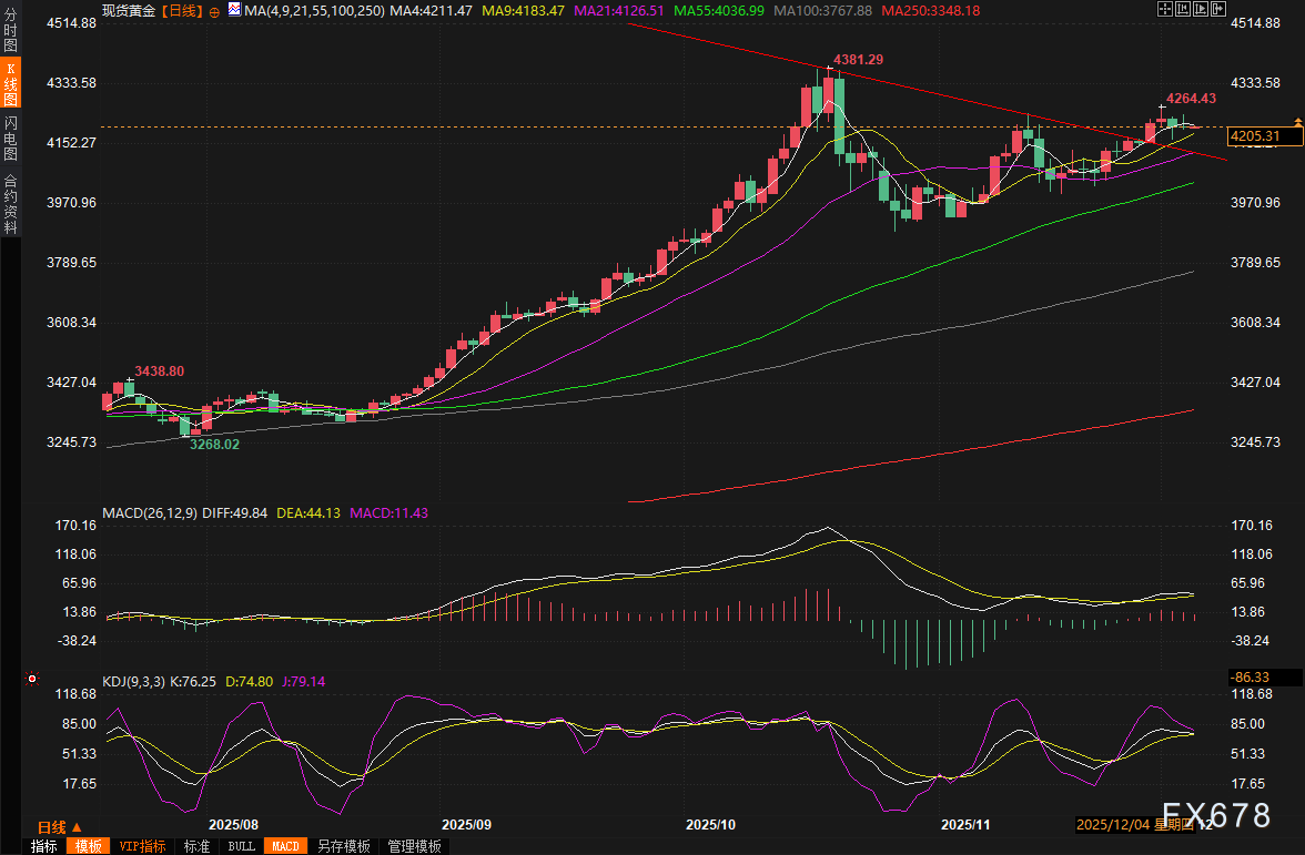 周四(12月4日)亚市早盘,现货黄金窄幅震荡,目前交投于4205美元/盎司附近。周三国际金市呈现出持稳态势,现货黄金价格大多数时间稳定在每盎司4200上方,疲软的美国就业数据一度帮助金价盘中触及4241.40美元的高点,但尾盘回吐涨幅,收报4203美元附近,接近收平。与此同时,白银价格周三刷新历史高点,盘中一度达到58.95美元,仍为黄金提供了支撑,也反映出市场对美联储降息的强烈预期,推动美国债市收益率回落、美元走软以及股市上涨。随着美国劳动力市场意外下滑和美联储宽松政策信号日益明显,白银的强势飙升已点燃贵金属板块热情,而黄金作为传统避险资产,似乎正蓄势待发。