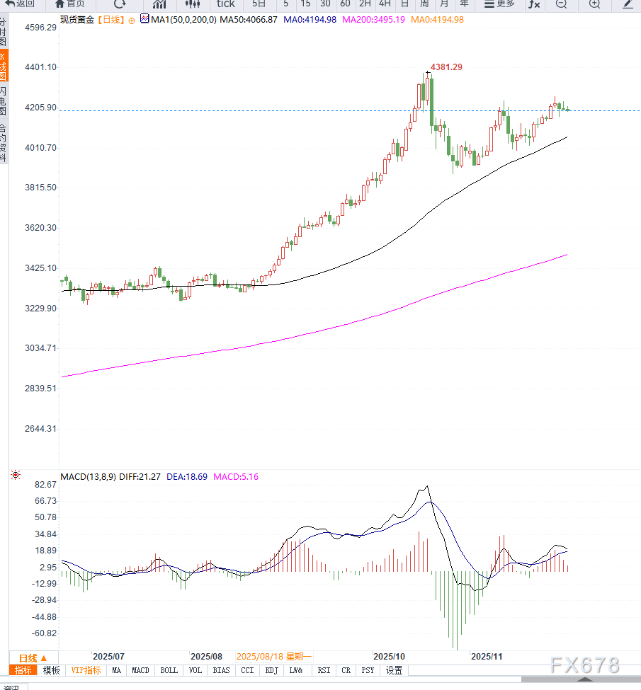 若金价继续站稳 4180—4200 美元区间,有望向4250美元乃至4280美元 发起进一步测试;反之,一旦跌破418 美元,多头将进入阶段性休整,下方或回探4150 美元 区域寻求新的买盘支撑。整体来看,多头趋势未被破坏,短线仍倾向震荡偏强。