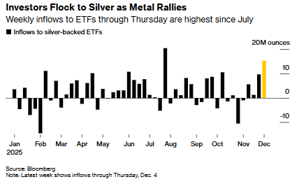 白银价格持续攀升,有望连续第二周上涨,交易所交易基金(ETF)的强劲资金流入正如火上浇油,给这波滚烫的涨势又添了一把柴。