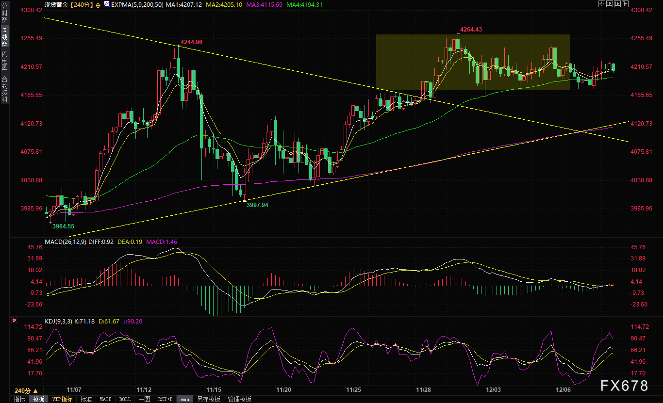 (现货黄金4小时图,来源:易汇通)北京时间14:25,现货黄金现报4205.59美元/盎司。