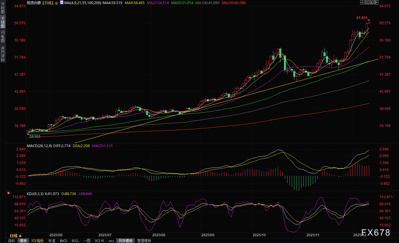 近期白银价格如火箭般蹿升,周二(12月9日)一举突破60美元/盎司大关,最高触及60.81美元,单日涨幅超过4%,年内累计涨幅已超过100%。周三(12月10日)现货白银延续涨势,一度刷新历史高点至61.45美元/盎司,正式宣告白银进入“60美元时代”。与此同时,金银比快速下行至68.6,创下2021年7月以来最低,意味着白银正在以远超黄金的速度狂奔,白银正在上演史诗级别的独立牛市。
