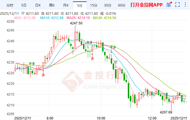 今日周四(12月11日)亚洲时段,美联储2025年最后一次利率决议尘埃落定,如期宣布降息25个基点,将联邦基金利率目标区间下调至3.50%-3.75%,完成年内“三连降”累计降息75个基点,符合市场87.6%的降息预期。尽管3名委员投出反对票(自2019年9月以来首次),点阵图显示2026年仅计划降息1次,但鲍威尔新闻发布会未释放更强鹰派信号,叠加美元指数快速下挫至98.6455、美债收益率集体下行,宽松环境与避险需求形成共振,推动黄金突破前期震荡区间。