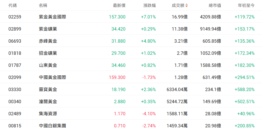 今日港股黄金股多数走强。截至发稿,紫金黄金国际涨超7%,赤峰黄金涨近5%,灵宝黄金涨超2%,招金矿业涨超1%。