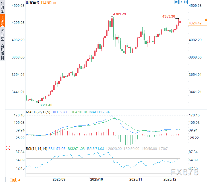 周一(12月15日)亚市时段,现货黄金震荡上涨约0.60%,延续前四个交易日涨势,前一交易日一度触及10月21日以来高点4353.36美元/盎司。