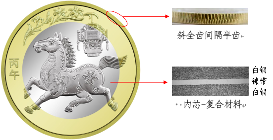 硬币外环为黄铜合金,内芯为具有独特机读性能的镍带复合白铜材料。防伪特征效果见图1。