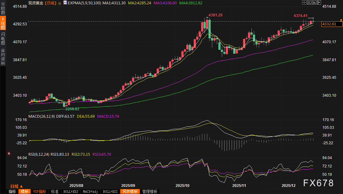 金价在周四的走势堪称教科书级的冲高回落。受CPI数据低于预期的影响,美联储1月降息概率略升,美债收益率跌至一周低位,两年期美债收益率报3.462%,10年期降至4.12%。这一环境为金价注入动能,推动其触及4374美元/盎司,接近10月20日创下的历史高点。然而,好景不长,随着市场消化数据,黄金的通胀对冲魅力迅速褪色。