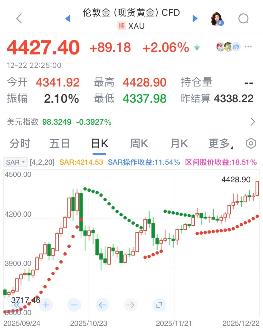 12月22日,伦敦现货金价强势拉涨,于12:55左右首次突破4400美元/盎司历史关口,再创历史纪录。截至发稿时,伦敦金盘中高点4428.9美元/盎司。周大福、老凤祥等主流金店零售金价同步上调,周大福报1368元/克,单日涨幅0.59%。