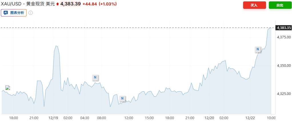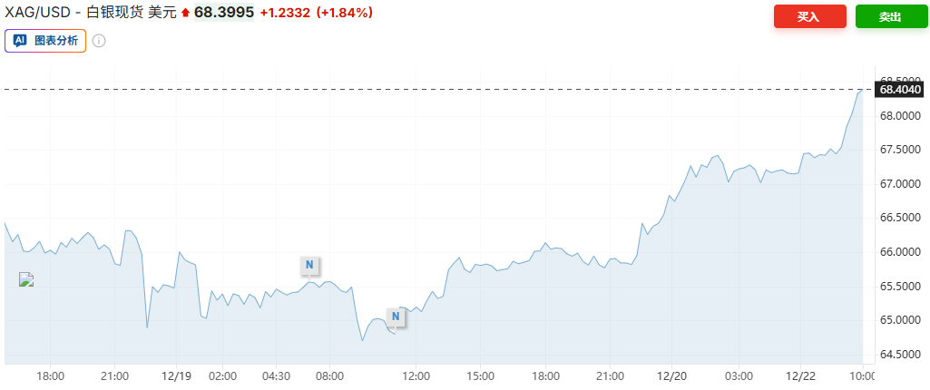 受地缘政治紧张局势加剧以及市场预期美联储明年将进一步降息的影响,白银价格继续创下历史新高,黄金价格也随之走高。周一,截至发稿,现货白银价格上涨1.84%,至68.3995美元/盎司。现货黄金价格上涨至接近4383美元/盎司,突破10月份创下的4381美元以上的历史高位,此前两周价格持续走高。