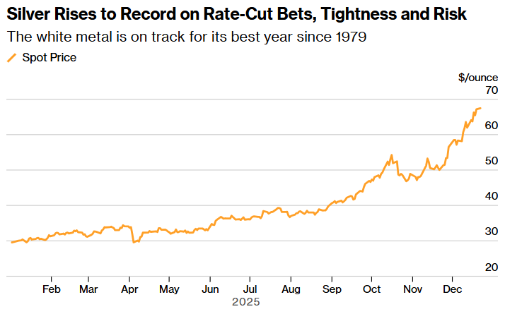 贵金属正迎来历史性的一年,黄金和白银均有望创下自 1979 年以来最大的年度涨幅。白银价格已翻了一番多,黄金价格也飙升了约三分之二,这主要得益于各大央行增加购买以及资金流入贵金属交易所交易基金。