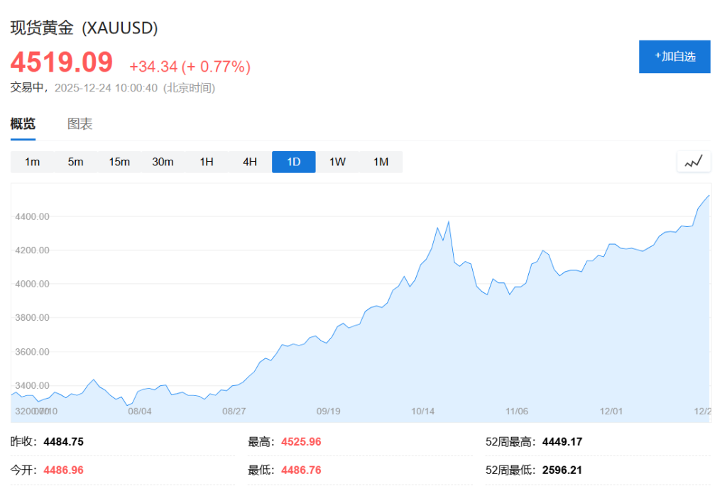 现货黄金价格有史以来首次突破每盎司4500美元,今年以来已累计上涨超过三分之二,有望创下自1979年以来的最佳年度表现。