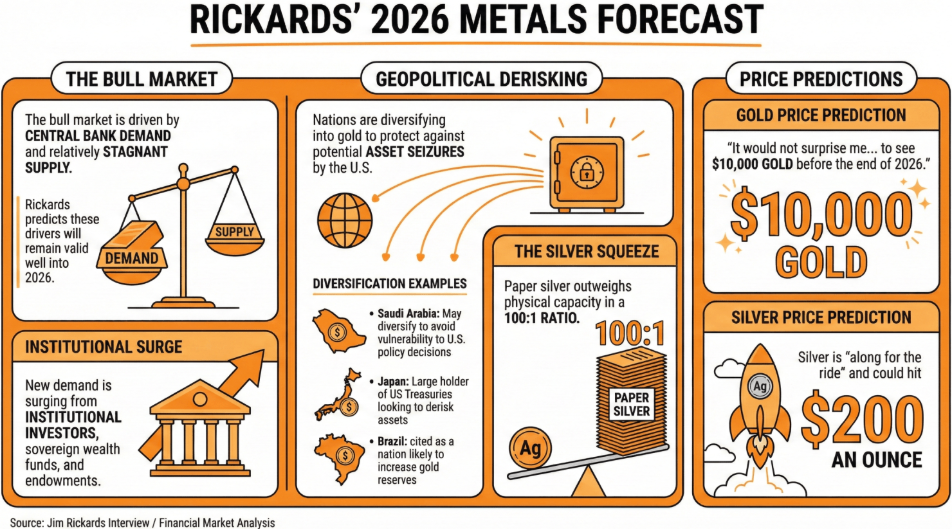 在最近的一次采访中,瑞卡兹表示,当前黄金牛市背后的传统驱动因素,即央行需求和相对停滞的供应,将在2026年依然有效。而新增的非传统因素可能会将价格推得更高。