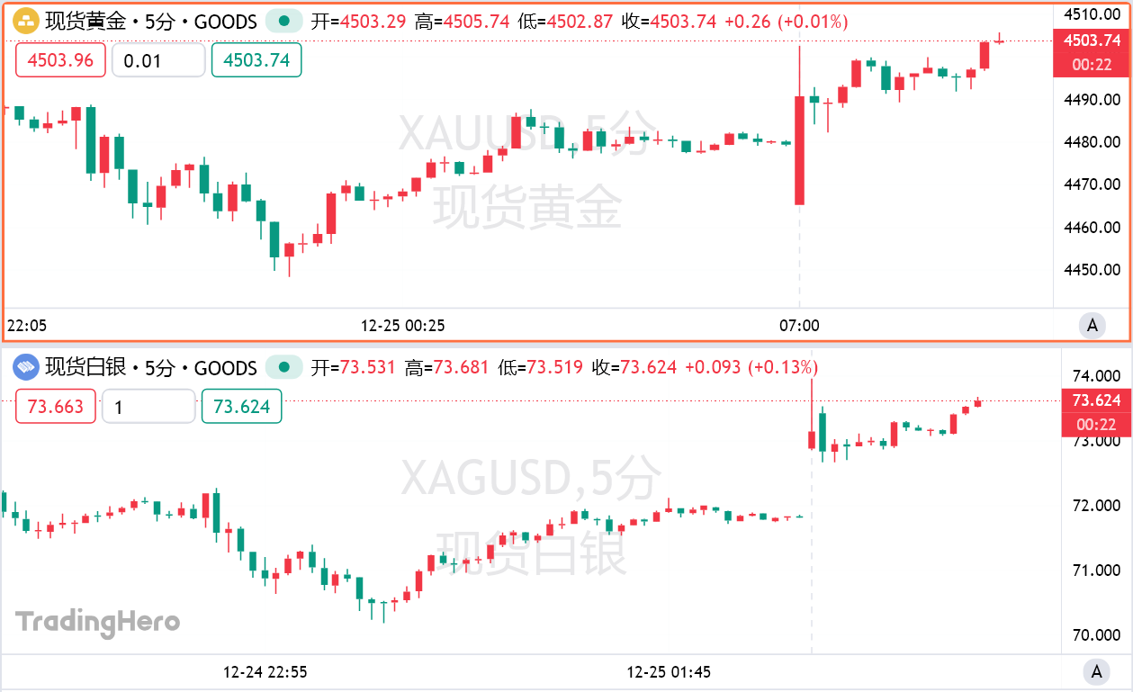 周五开盘,现货白银跳空高开,突破73美元/盎司,再创历史新高,截至发稿报73.6美元/盎司。现货黄金重回4500美元/盎司之上,日涨幅超0.5%。金银比今年累跌超32%,最新报61.60,创2014年2月以来新低。