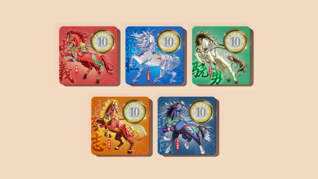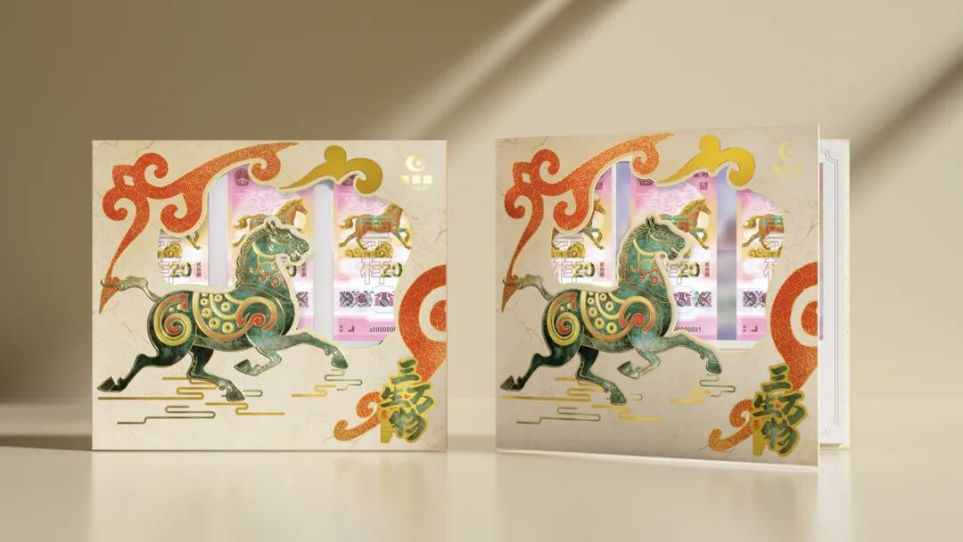 文化赋能是本次新品的核心亮点。《战马 五虎龙骧》的卡币设计基于四大名著的《三国演义》刘备及其五虎上将的战马,寓意“战马贺岁,福运登门”,同时创新性融入景泰蓝珐琅彩画非遗技艺,将刘备“的卢”战马以立体珐琅彩形式呈现于卡币之上,经多层釉彩填绘与反复窑烧,实现传统工艺与国币的跨界对话,50:1的盲盒收藏比例更添探索乐趣。《天马瑰宝》取材《山海经》神瑞天马形象,采用传统吉祥色光明砂色为主调,“币钞证一体”的装帧形式兼具防伪性与收藏性,传递平步青云的新春祝愿。《三生万物》则以《道德经》哲学思想为内核,结合东汉“马踏飞燕”青铜艺术元素,将“天地人和”的传统文化智慧融入设计,彰显生生不息的吉祥寓意。