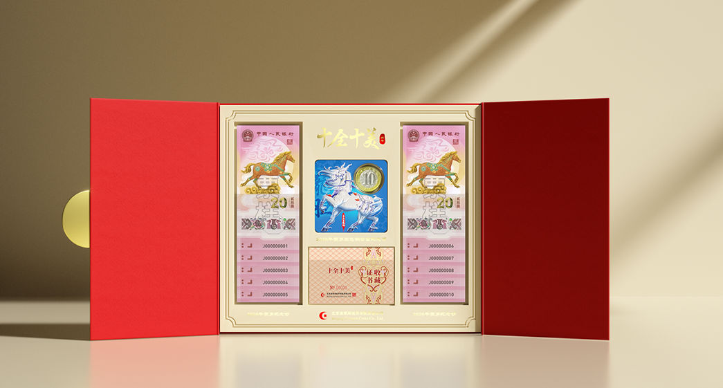 在工艺与收藏价值上,新品延续康银阁高标准要求。《十全十美》精选无4、7标准十连号纪念钞,搭配镂空开窗式装帧与中国红主色调,每10套附赠一张隐藏款立体珐琅卡币,实现“颜值与价值”双重在线;《骏驰九州 国币传承》沿用故宫太和殿屏风元素,活力橙色调谐音“马到成功”,百连号纪念钞与竖版证书一一对应的设计,完美契合生肖纪念币“小量发行+版本独特”的核心收藏逻辑。五款产品专属宣传语各具韵味,从“开岁得骏 币纳千祥”到“国币传承 价值典范”,既凝练产品特色,又传递新春美好期许。