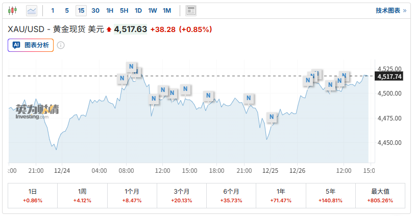 截至发稿,现货黄金上涨0.85%,报每盎司4517.63美元,此前一度触及每盎司4531.24美元的纪录高点;2月交割的纽约黄金期货上涨0.97%,报每盎司4546.5美元。