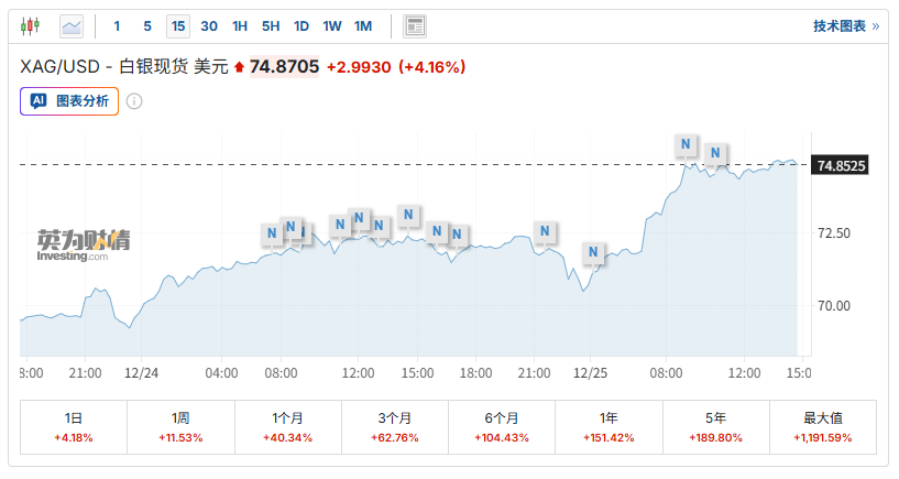 现货白银上涨4.16%,报每盎司74.8705美元,此次一度突破75美元大关。