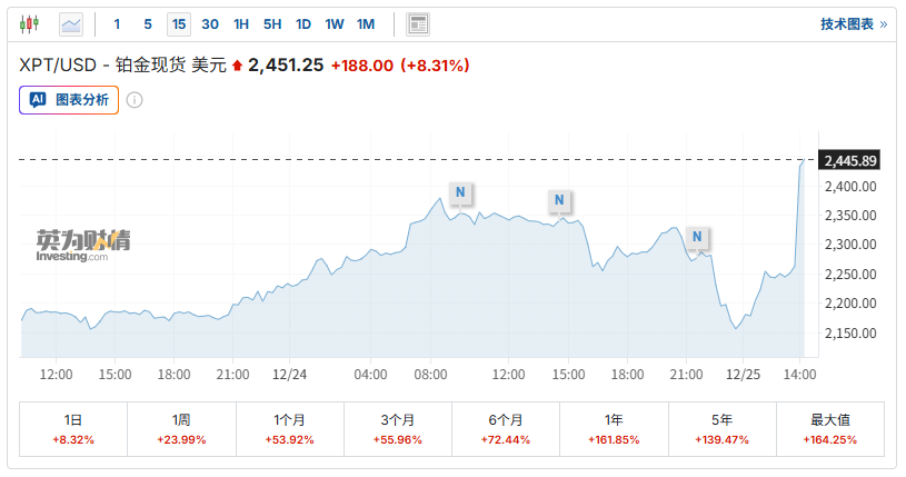 与此同时,现货铂金上涨超8%,报每盎司2451.25美元,续创历史新高;钯金上涨5.55%,报每盎司1822.70美元,延续了前一交易日触及三年高点的涨势。所有贵金属本周均有望录得涨幅。