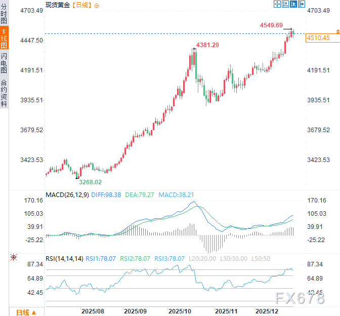 美国总统特朗普上周日(12月28日)表示,在佛罗里达州与乌克兰总统泽连斯基会晤后,旨在结束俄乌冲突的谈判已取得进展,但特朗普承认双方在领土问题上仍存在棘手分歧。黄金的避险溢价面临回吐压力,周一亚市时段,现货黄金震荡走低,目前交投于4515美元/盎司附近,跌幅约0.31%,但仍处于较高点,位于历史高点(4549.69)附近下方不远处。