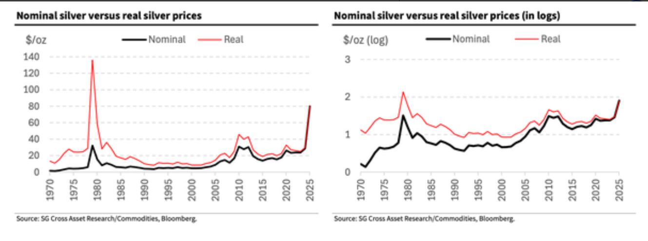 分析师们认为,你如何看待白银的价格走势,在很大程度上取决于你如何绘制技术图表。在标准的线性刻度下,近期突破80美元/盎司以上的走势看起来戏剧化且很大程度上由投机情绪所驱动。“然而,当以对数刻度进行深度绘制时,这轮上行看起来要稳定得多,并与过去25年白银长期复合增长趋势更为一致。”法兴银行研究团队写道。
