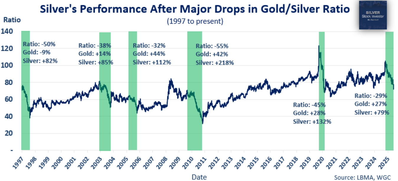 “自1997年以来,该比率共经历了五次大幅下跌,”他说。“如果你取这些下跌的平均值,会得到比率下跌44%。因此你可以认为,如果该比率从今年4月约105的近期峰值下跌44%,意味着它将降至约59,而我们目前处于67。让我们保守一点,假设金价保持在4000美元。那么用4000美元除以59,得到约67美元。我们已经达到了这个水平。”