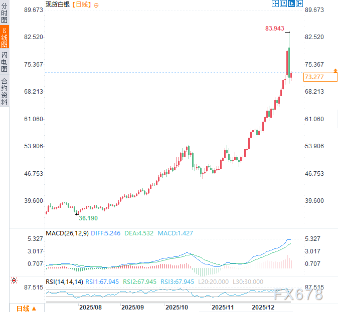 (现货黄金日线图,来源:易汇通)现货白银周一一度触及历史高点83.94美元/盎司,而后大幅回落,收盘暴跌8.9%,收报72.11美元/盎司。周二亚市时段逢低买盘涌入,现货白银回升,日内涨幅约1.87%,交投于73.50美元附近。