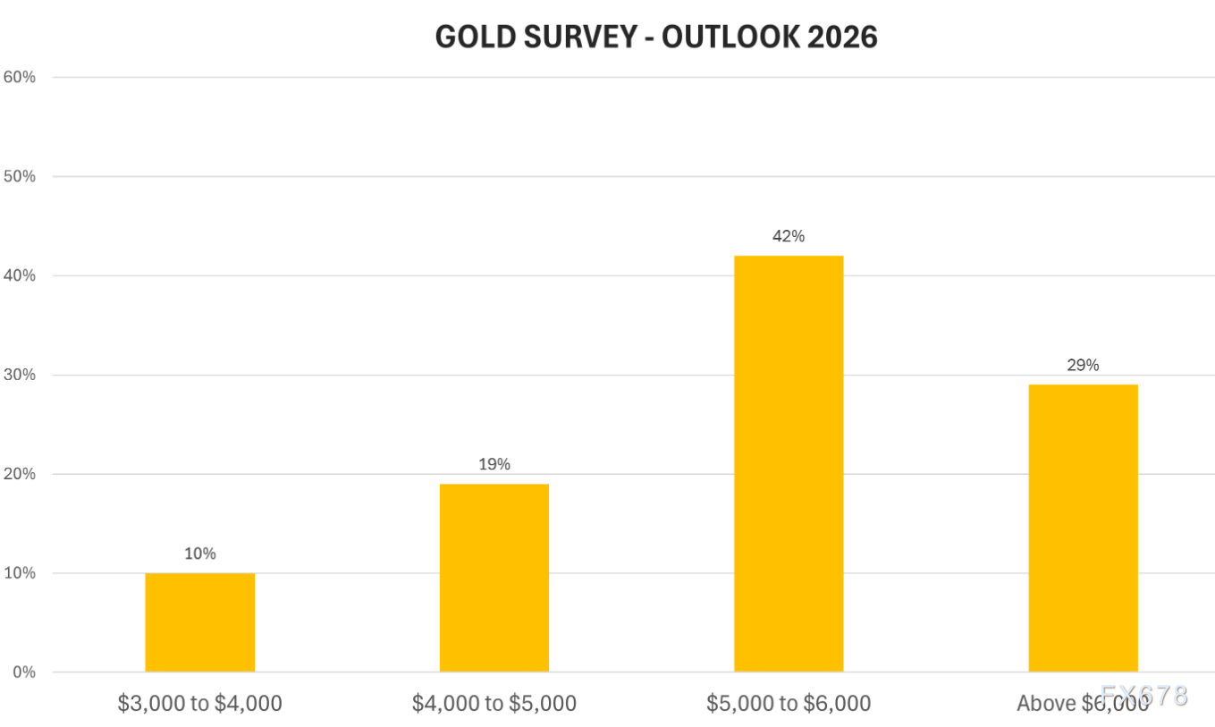 抛开短期波动,从更长周期视角审视,黄金市场洋溢着乐观情绪。回顾2025年,金价实现了约65%的惊人涨幅,表现远超多数大宗商品和资产类别。进入2026年,这种看涨预期有增无减。Kitco新闻的年度调查揭示了市场的狂热信心:在参与调查的零售投资者中,高达42%的人预测金价将在2026年升至5000至6000美元之间;更有29%的投资者看高至6000美元以上。相比之下,认为金价会跌回4000美元以下的仅占十分之一。这种来自“民间”的强烈看多情绪,是市场情绪的重要风向标。