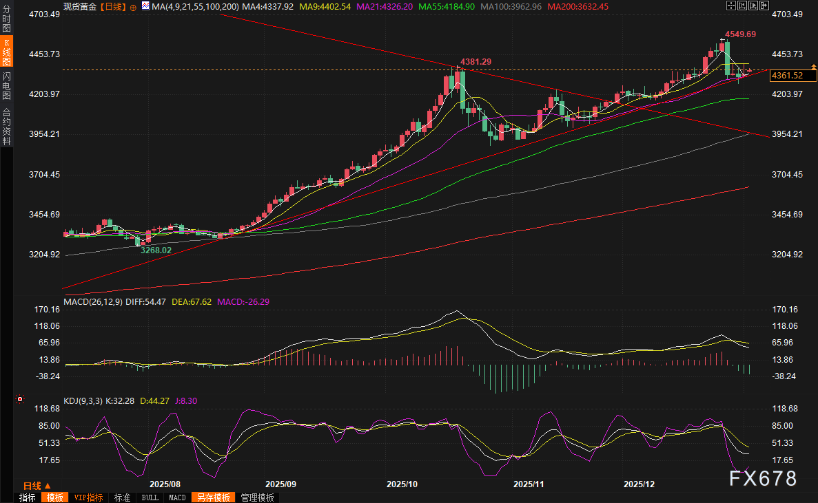 目前,利率期货市场已充分定价了2026年至少两次降息的预期,这与美联储内部近期偏鹰派的分歧姿态形成对比。道明证券的Bart Melek等策略师认为,关于降息的讨论,叠加对美国债务风险和贸易政策的担忧,共同构成了推动黄金上涨的宏观背景。然而,短期来看,美元的反弹确实会抑制以美元计价的黄金的上涨空间,使得金价走势呈现一种“避险推升”与“美元压制”之间的拉锯状态。上周五金价自高点4402美元回落,便是这种拉锯的直观体现。