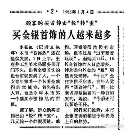 俗话说“开年纳金,财源广进”。一到元旦,菜百等地的黄金柜台都热闹起来。上世纪八十年代中期,人们买金的热情也很高涨。1985年1月1日上午,王府井工艺美术品服务部开门不久,出售金银首饰的柜台前就围满了人。一个女青年捧着一个装金戒指的丝绒盒,首先挤出人群,她是1985年北京第一个买到金银饰品的市民。(1985年1月4日《北京晚报》2版《买金银首饰的人越来越多》)