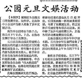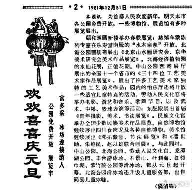 这种过元旦的热情,延续到了上世纪八十年代。1981年之初,一场“喜洋洋文艺联欢会”奏响了新年乐章。歌坛新秀谢莉斯和王洁实的男女声二重唱,把场内气氛推向高潮。在人们的一再要求下,他们一连演唱了七首歌曲。那时候,真有一种蓬勃进发、万象更新的感觉。(1981年1月2日《北京晚报》4版《“喜洋洋文艺联欢会”受到首都观众欢迎》)